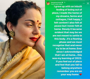 मुंबई, 31 दिसंबर (आईएएनएस)। बॉलीवुड की 'क्वीन' कंगना रनौत ने अपने 'सपनों' को याद करते हुए वर्ष 2023 में मिली सीख को शेयर किया। उन्होंने कहा, ''अगर आप किसी जगह असहज महसूस कर रहे हैं तो मानो आप अपने घर की तरफ जा रहे हैं।''