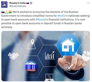 नई दिल्ली, 1 नवंबर (आईएएनएस)। रूस ने भारतीय नागरिकों के लिए अपने वित्तीय संस्थानों में बैंक खाते खोलने के लिए नियमों को आसान बना दिया है।