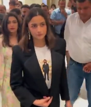 मुंबई, 1 दिसंबर (आईएएनएस)। 'एनिमल' की विशेष स्क्रीनिंग में मौजूद अभिनेत्री आलिया भट्ट ने फिल्म में अपने पति रणबीर कपूर के किरदार वाली टी-शर्ट पहनकर सबका ध्यान अपनी ओर खींचा।