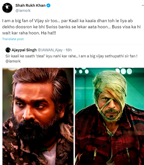 मुंबई, 10 सितंबर (आईएएनएस)। बॉलीवुड सुपरस्टार शाहरुख खान की फिल्म 'जवान' बॉक्स-ऑफिस पर धूम मचा रही है। वहीं एक्टर ने सोशल मीडिया पर फैंस के सवालों का जवाब दिया।