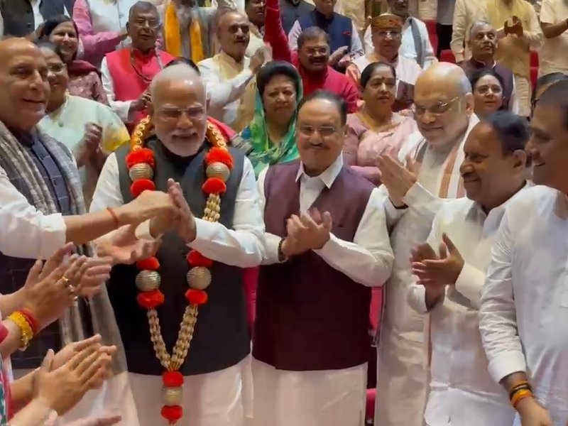 नई दिल्ली, 5 अगस्त (आईएएनएस)। राष्ट्रीय जनतांत्रिक गठबंधन (एनडीए) संसदीय दल की बैठक में प्रधानमंत्री नरेंद्र मोदी का 'हर हर महादेव' के नारों के बीच तालियों की गड़गड़ाहट के साथ स्वागत और अभिनंदन किया गया। 'ऑपरेशन सिंदूर' और 'ऑपरेशन महादेव' की सफलता के बाद प्रधानमंत्री मोदी का माला पहनाकर यह भव्य स्वागत हुआ।