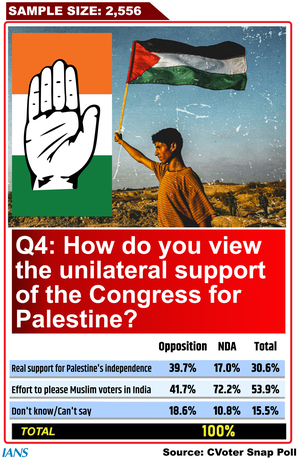 नई दिल्ली, 18 अक्टूबर (आईएएनएस)। इजरायल और हमास के बीच चल रहे संघर्ष पर सीवोटर के एक विशेष सर्वे से पता चलता है कि अधिकांश भारतीयों को लगता है कि कांग्रेस फिलिस्तीन के खुले समर्थन में सामने आई है क्योंकि उसे उम्मीद है कि इसके परिणामस्वरूप आगामी चुनाव में उसे मुस्लिम वोट मिलेंगे।