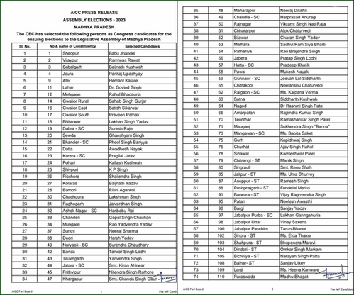 भोपाल, 15 अक्टूबर (आईएएनएस)। मध्य प्रदेश में होने वाले विधानसभा चुनाव के लिए कांग्रेस की पहली सूची आ गई है जिसमें 144 उम्मीदवारों के नाम हैं। इसमें कई नाम चौंकाने वाले हैं तो वहीं कुछ उम्मीदवारों की सीट भी बदली गई है।