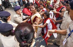 बिहार : राजद कार्यालय के बाहर धरने पर बैठी आंगनबाड़ी सेविकाओं पर पुलिस ने किया बल प्रयोग